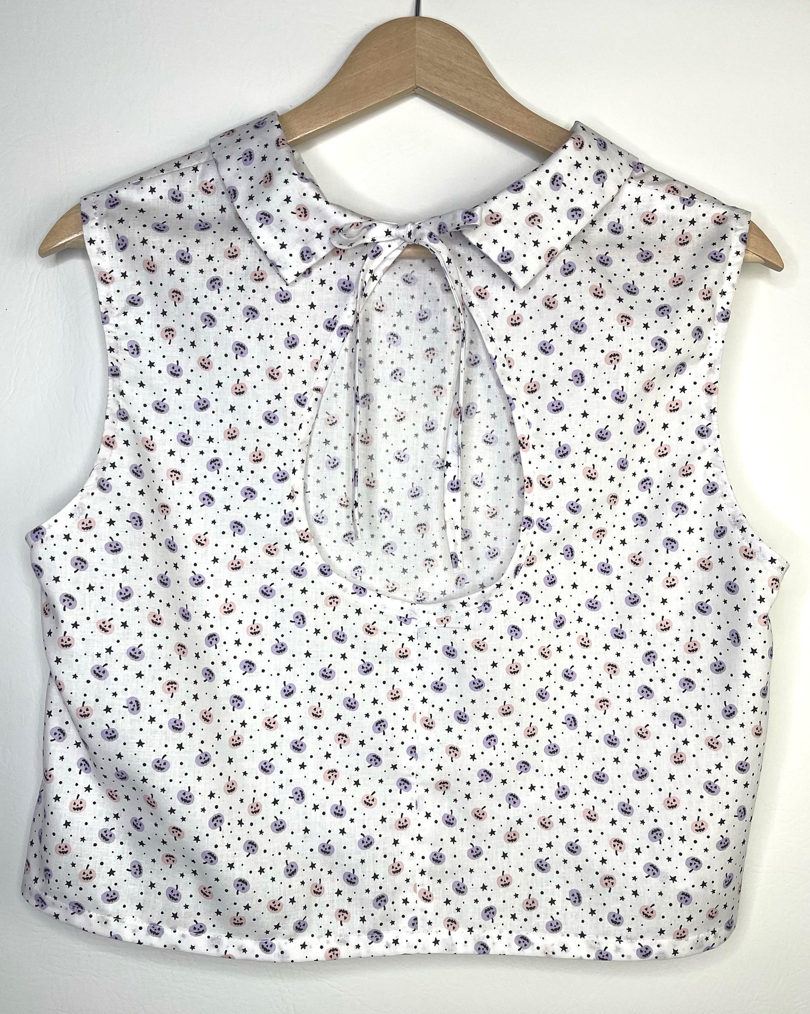 La Ana Crop Top es una pieza fresca y juvenil para todas. Esta pieza tiene mangas esto la hace perfecta para las noche de jangueo o dia de shopping. En la parte de atras tiene una apertura lo que la hace una pieza sexy ya que muestra un poco de la espalda. Ana Crop Top en tela 100% algodon fondo blanco con diseñe calabazas fantasmas en colores rosa y violetas.