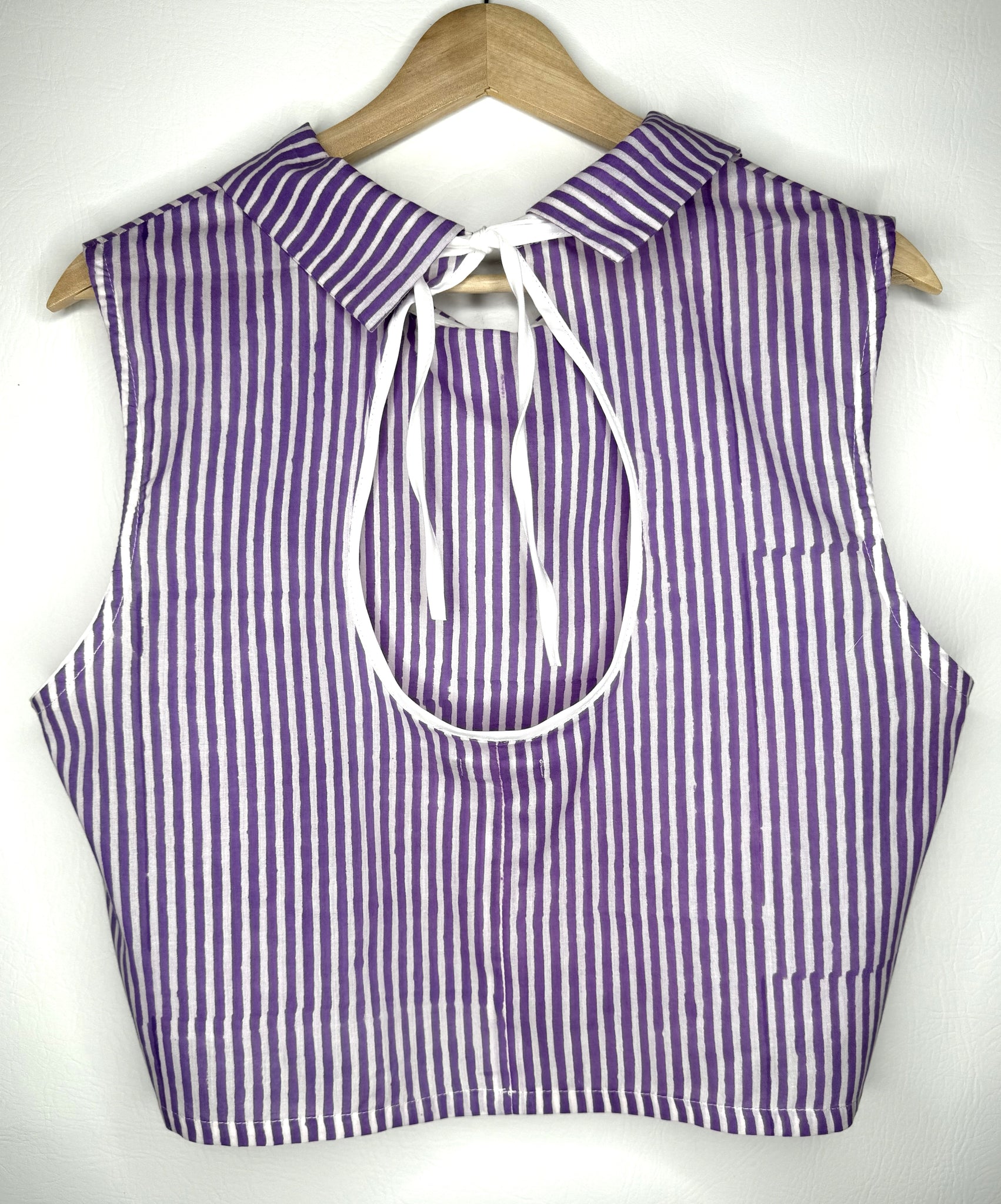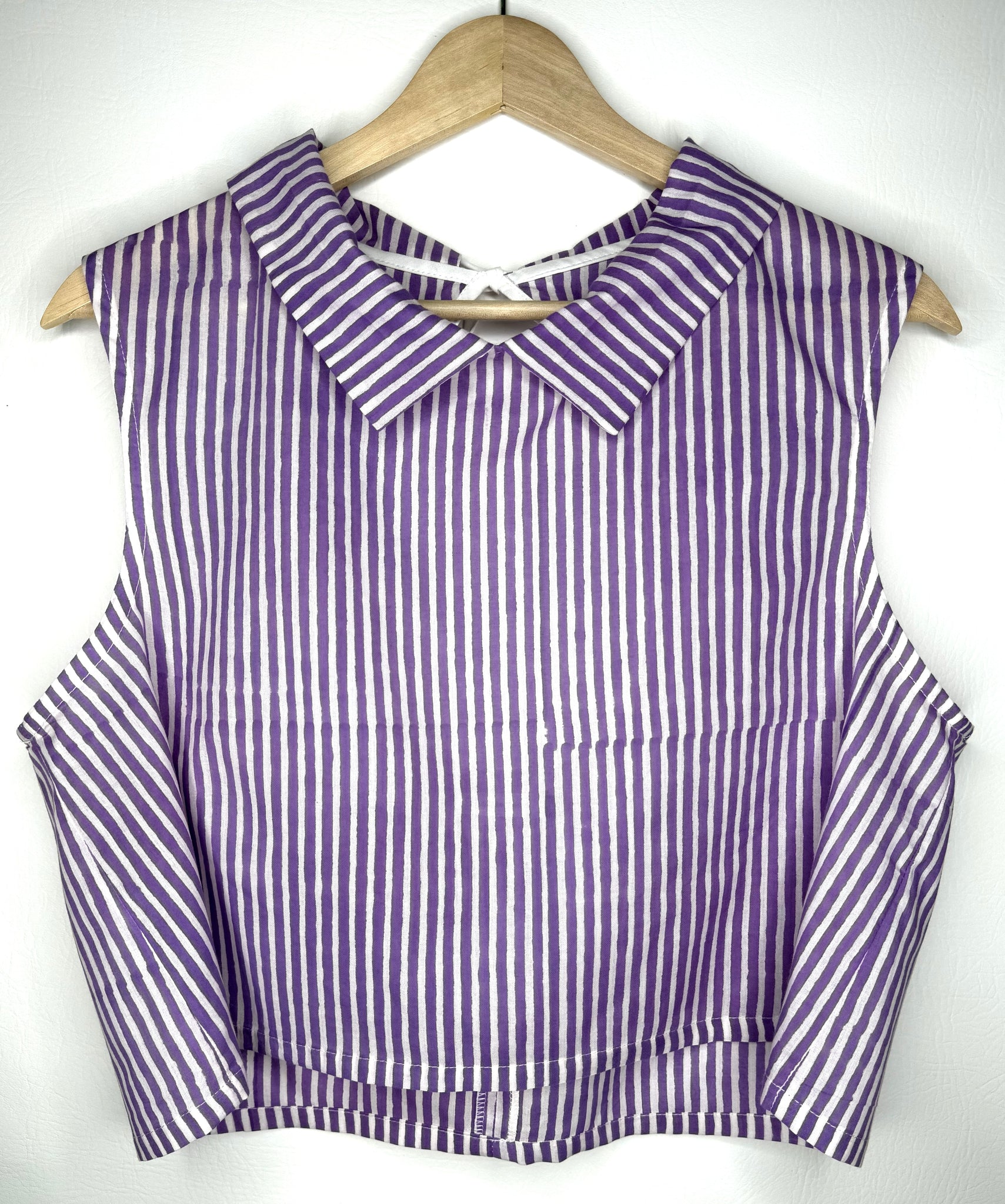 La Ana Crop Top es una pieza fresca y juvenil para todas. Esta pieza tiene mangas esto la hace perfecta para las noche de jangueo o dia de shopping. En la parte de atras tiene una apertura lo que la hace una pieza sexy ya que muestra un poco de la espalda. Ana Crop Top Trabajada en tela 100% algodon Indio con estampado de lineas violetas, estampadas a mano.