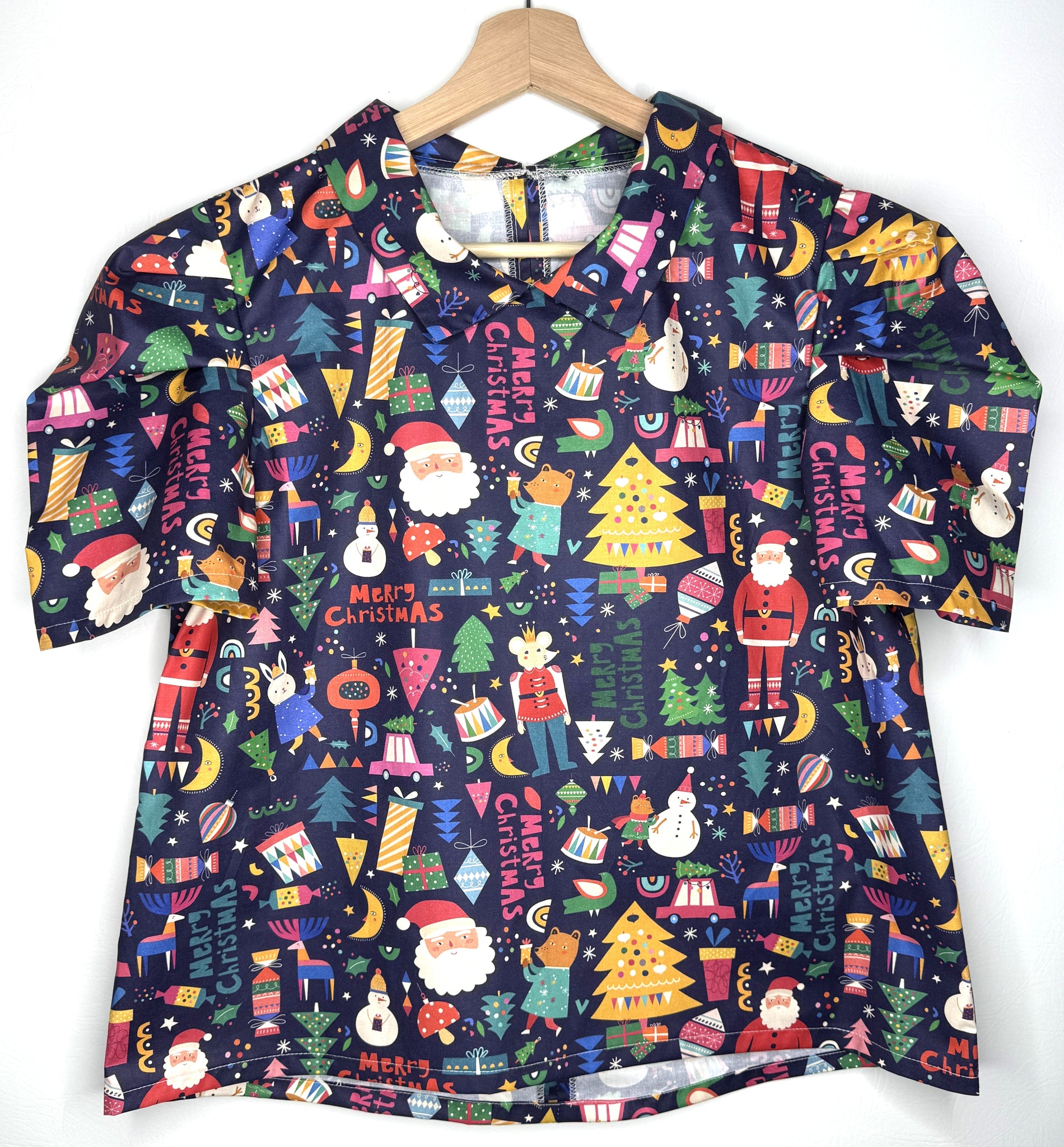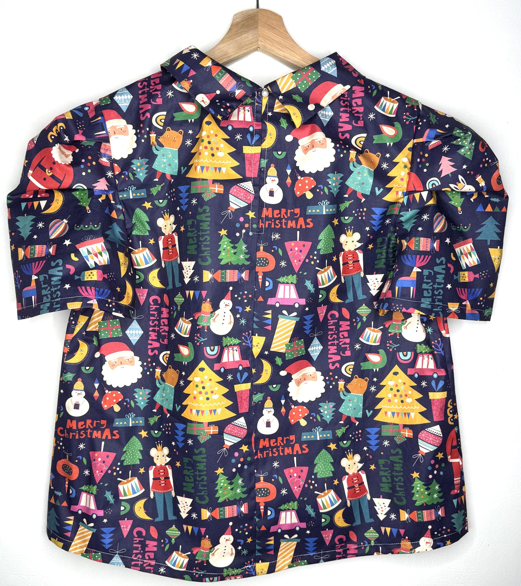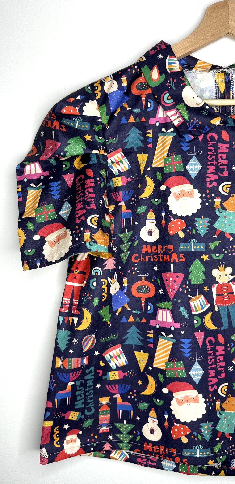 La Cucipy es una hermosa camisa con cuello, tiene unas pinzas en las mangas que les da un toque chic. En la parte de atras cuenta con una apertura y su cierre es con un pequeño boton. A esta camisa le puedes dar un toque elegante y tambien un toque casual de lo que si estoy segura es que con la Cucipy te vas a ver no solo hermosa, tambien UNICA. La Cucipy es trabajada en tela algodon fondo azul con diseño de navidad, envoltura de dulces, arboles de navidad, dulces envueltos, raton del nutcracker, entre otros.