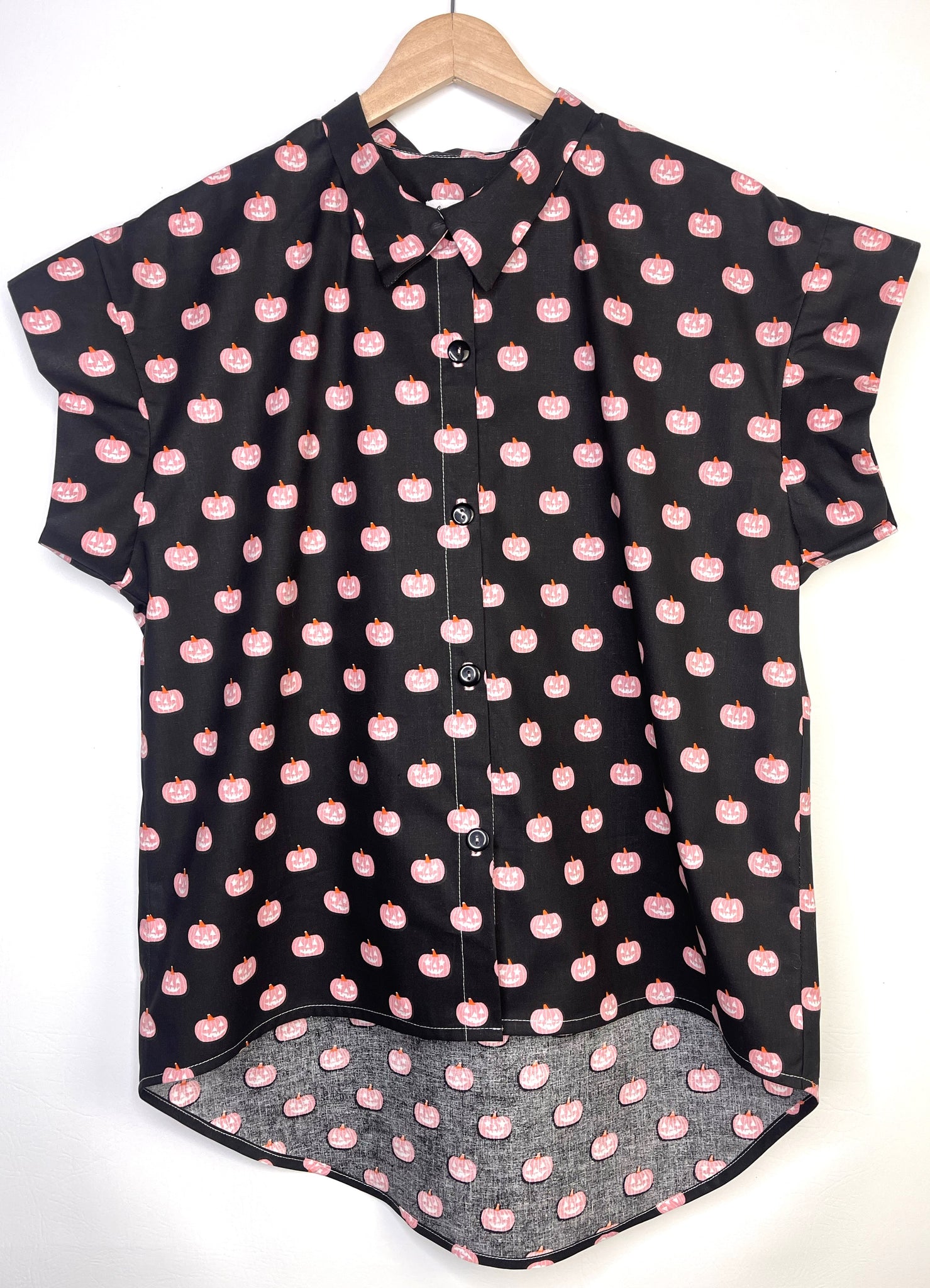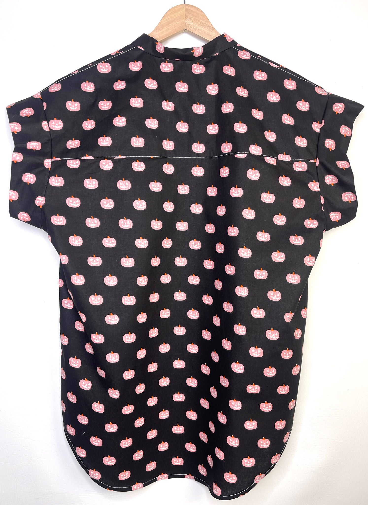 Esta Pimpo esta trabajada en tela 100% algodon en fondo negro con diseño de calabazas en color rosa.