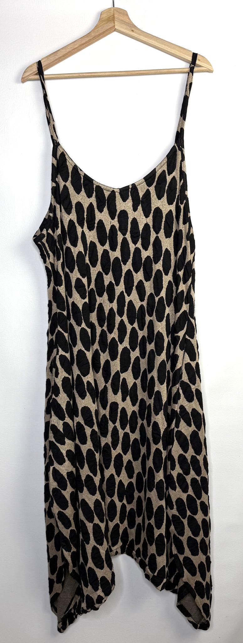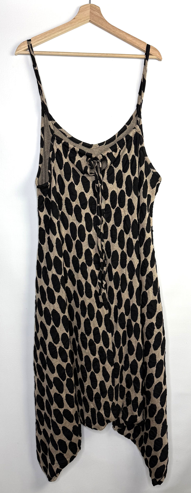 El Patilongo es un oversize traje Harem. Es la comodidad y frescura perfecta. Perfecto para un dia de playa, con tenis en un dia de parque, un dia de tiendas, para estar comodo en casa y hasta para ir de jangueo con unas plataformas o sansalias, porque no? Cuenta con un bolsillo a cada lado y una apertura en la espalda y se ajusta con un lazo. Este Patilongo esta trabajado en tela cotton knit fondo crema con ovalos en color negro.