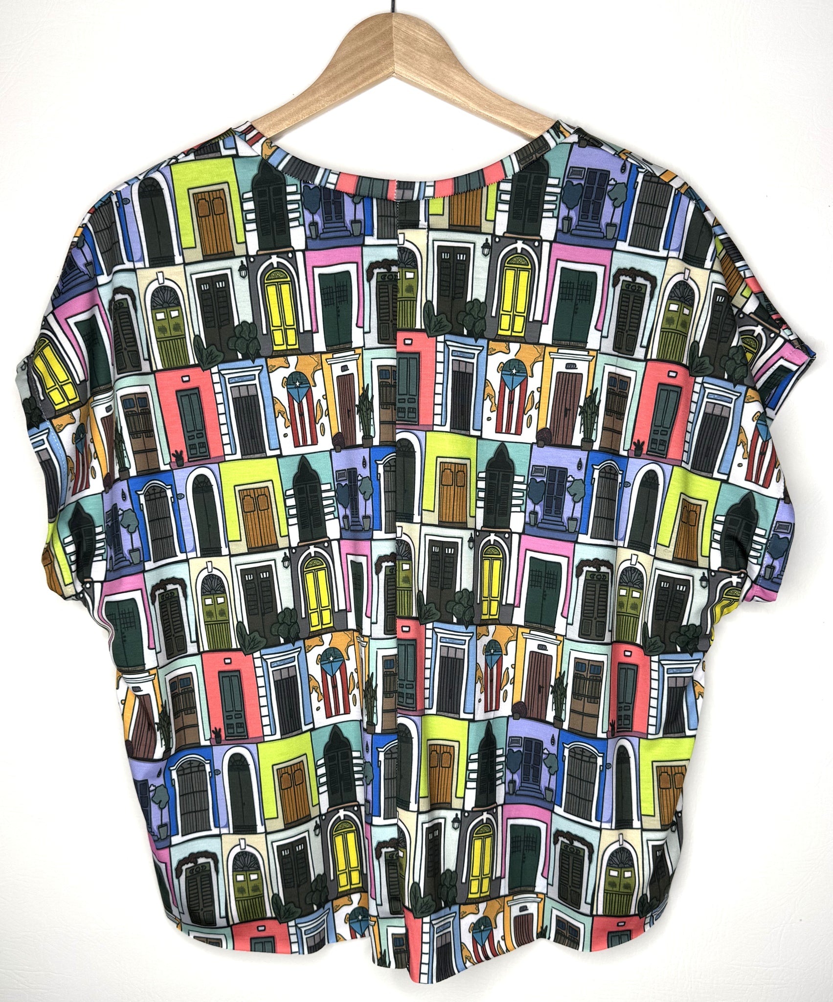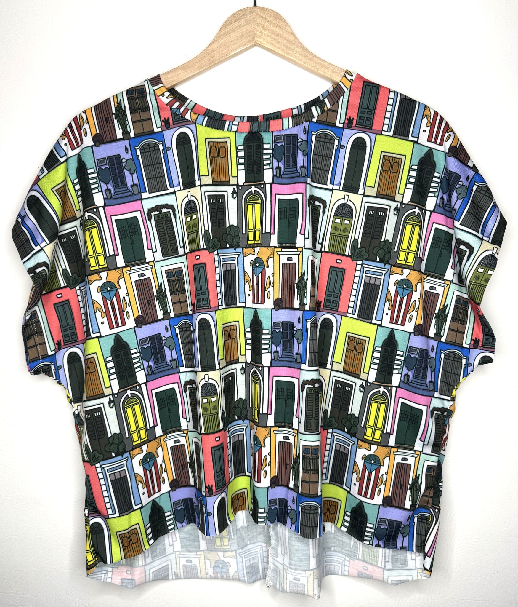 Esta T-shirt esta trabajada en tela Jersey con diseño de las puertas del viejo San Juan y una de ellas es la bandera de Puerto Rico. Las terminacion del ruedo de la Tshirt son en raw cut.