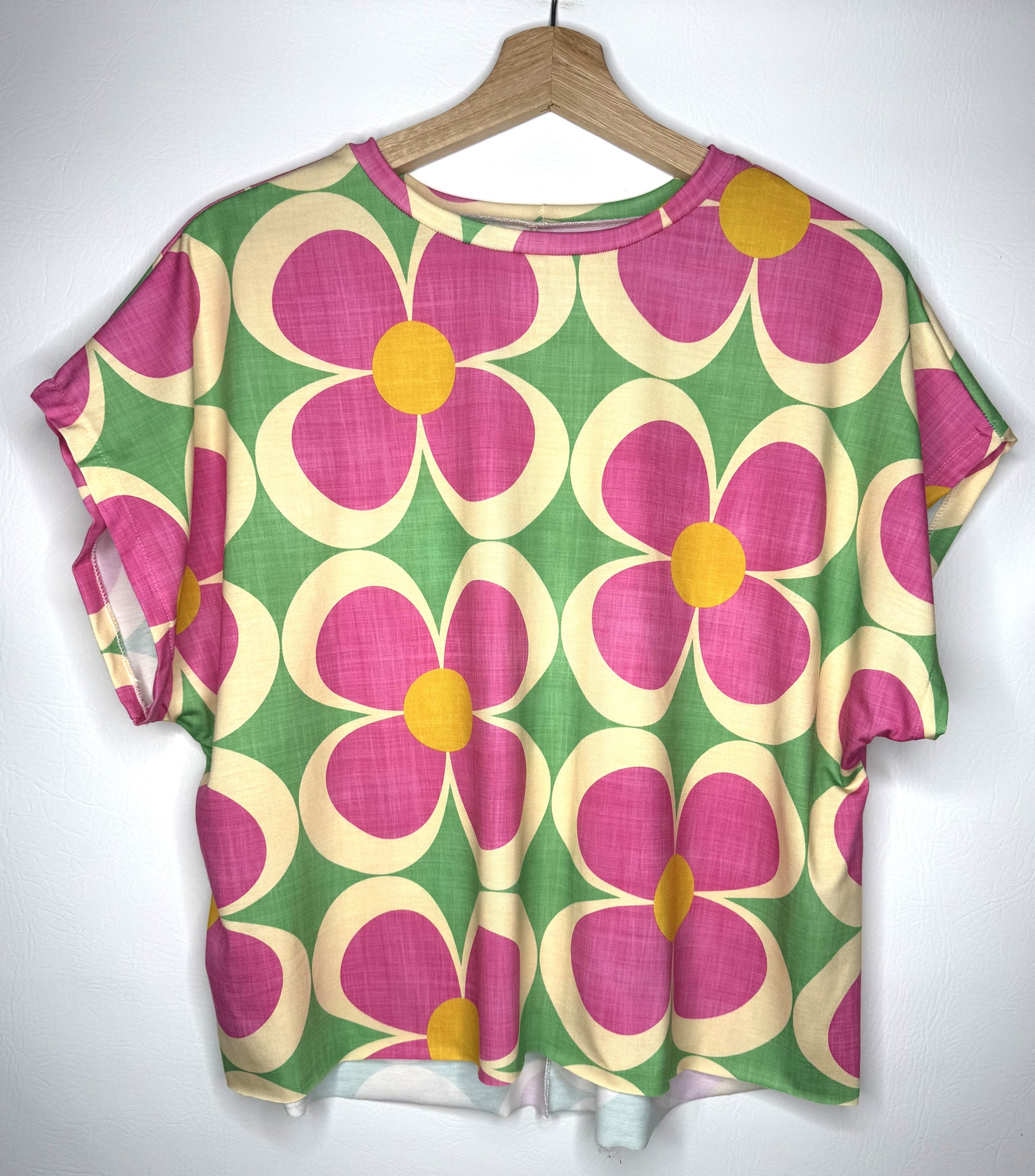 Esta T-shirt esta trabajada en tela Jersey con fondo en color verde y diseño de flores en colores rosa y crema, centro en color amarillo. Las terminacion del ruedo de la Tshirt son en raw cut.